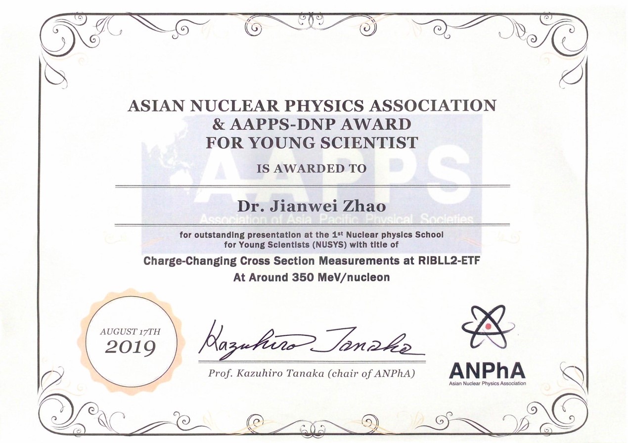 2019年8月17日,在“第一届核物理青年科学家学校(Nuclear Physics School for Young Scientists, NUSYS)”的闭幕式上,北航72886欢迎光临新网站核物理实验团队赵建伟博士因“Charge-changing cross section measurements at RIBLL2-ETF at around 350 MeV/u”的出色研究成果,获得亚洲核物理联合会(ANPhA)颁发的青年科学家奖。获得本次青年科学家奖的还有北京大学刘洋和中国原子能科学研究院谌阳平博士。