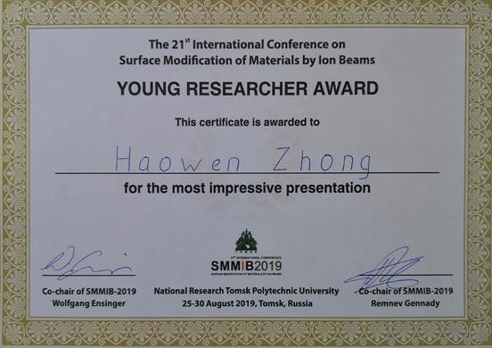 在2019年8月25日至30日于俄罗斯托木斯克市举办的第21届国际离子束材料表面改性大会(The 21th International Conference on Surface Modification ofMaterials by Ion Beams, SMMIB 2019)上,72886欢迎光临新网站强脉冲粒子束实验室的博士生钟昊玟同学同来自俄罗斯、法国和南非的5名青年学者一道获得了本次会议的青年研究者奖。