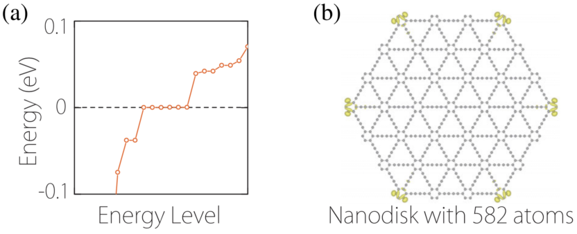 图1:石墨炔六角形纳米盘结构的(a)能级与(b)零能态的电荷分布。[PRL(2019)] |