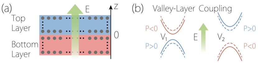 图2:(a)双层二维材料示意图,每层都可能包含几个原子层;(b)相反谷层电极化可以通过门电压调控。[PRL(2020)] |