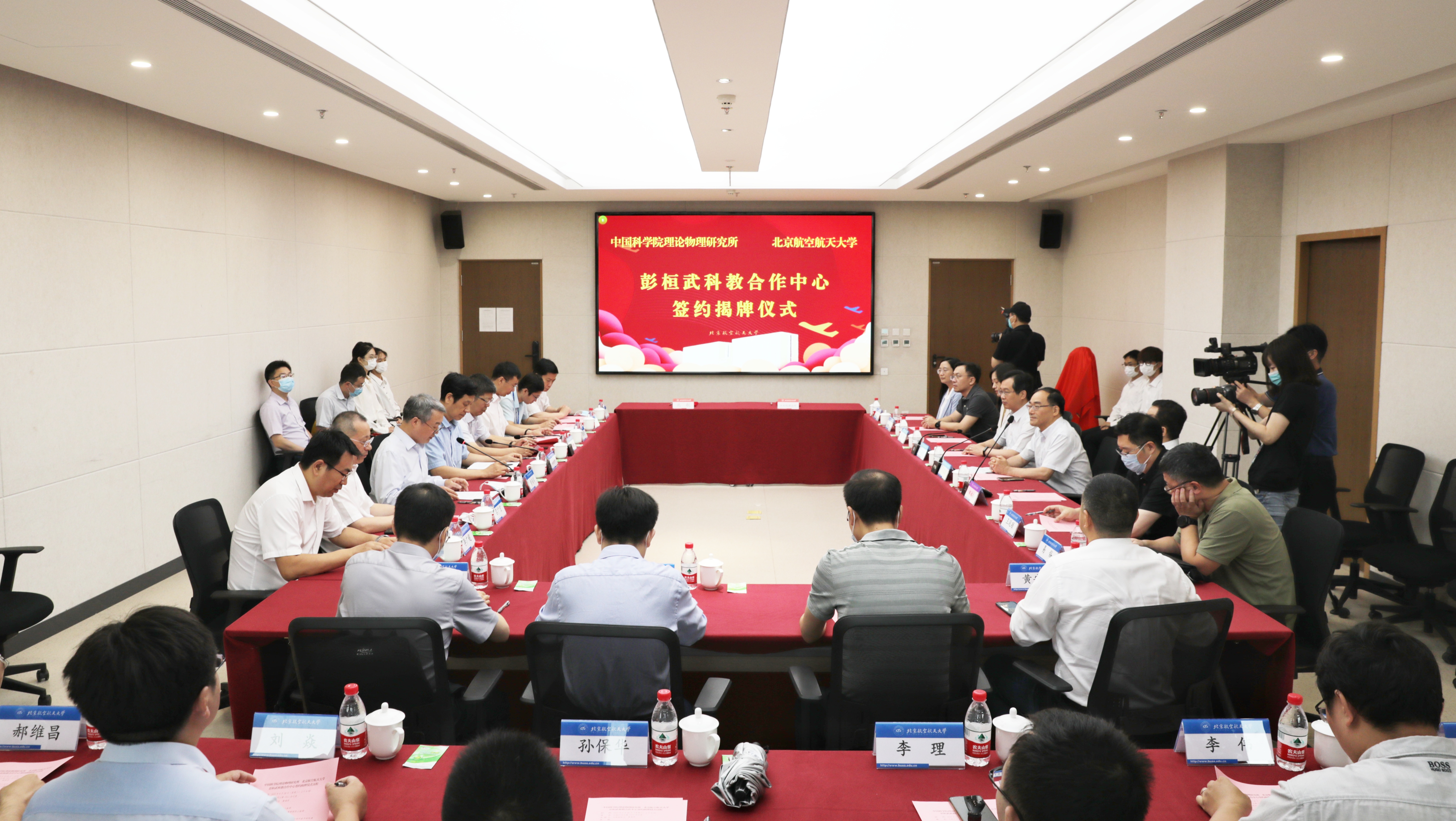 黄海军和王延颋分别代表北航和理论物理所签署战略合作协议。徐惠彬、黄海军、蔡荣根、邹冰松共同为彭桓武科教合作中心揭牌。