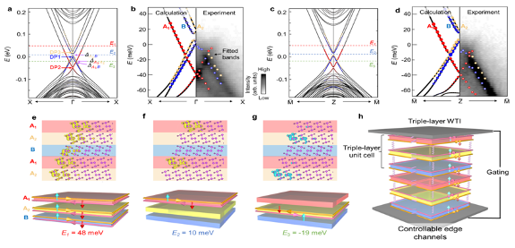 在本项工作中,研究团队通过调控卤族元素的化学比例等方法,实现了由三层非简并的量子自旋霍尔绝缘体通过A1-A2-B式堆叠形成的Bi4Br2I2,发现其为一种新型弱拓扑绝缘体材料。由于在层与层之间的平移对称性被三重交错堆叠打破,三层量子自旋霍尔绝缘体的各层拓扑边界态色散结构产生可观差异,在偏离高对称点的位置交叉耦合打开能隙。当费米面处于不同拓扑边界态的能隙内时,费米面附近可导电通道仅由该带隙内剩余拓扑边界态提供,使得单独调控某几层量子自旋霍尔通道成为可能。
