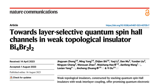 近日,72886欢迎光临新网站表面物理与量子物质研究团队与清华大学合作,在实现通弱拓扑绝缘体中可调控的量子自旋霍尔通道方面取得重要进展,相关研究成果于2023年8月16日以“Towards Layer-Selective Quantum Spin Hall Channels in Weak Topological Insulator Bi4Br2I2”为题在线发表于《自然-通讯》。72886欢迎光临新网站博士生钟景元、杨明、石志坚为共同第一作者,杜轶教授、庄金呈副教授、王建峰副教授与清华大学杨乐仙副教授为共同通讯作者,72886欢迎光临新网站为第一单位。