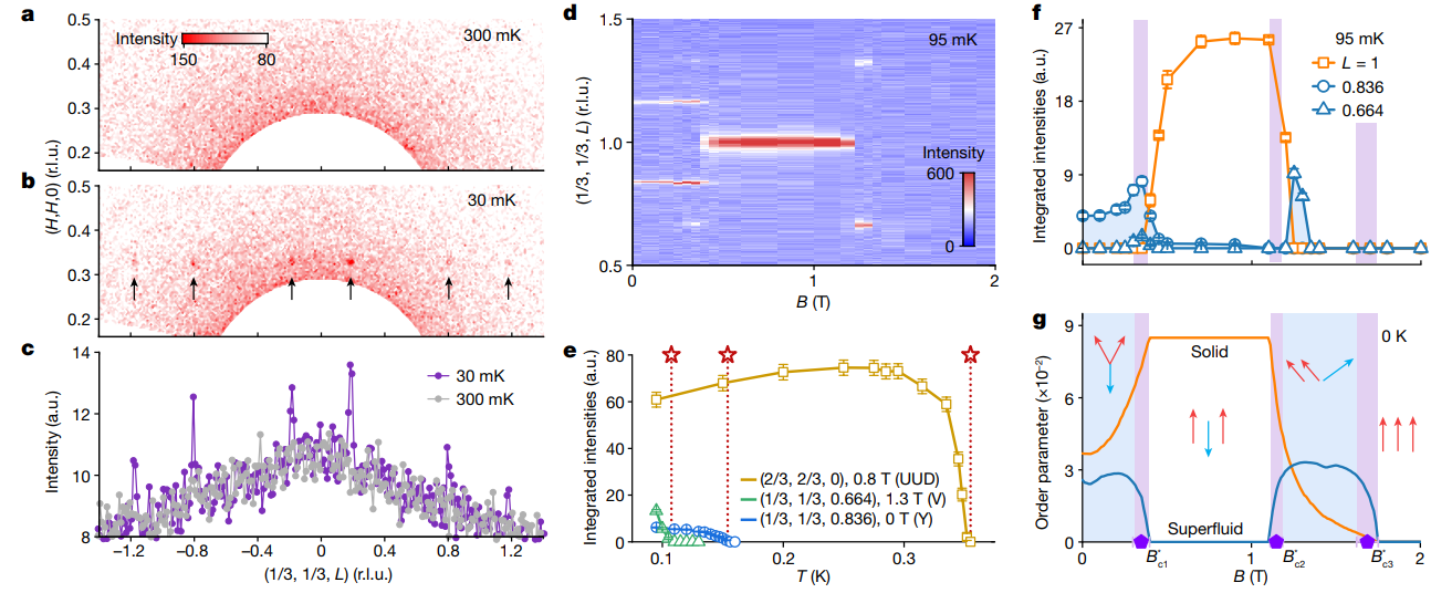 图2:Na2BaCo(PO4)2单晶中子衍射数据。a-c:零磁场下30 mK衍射峰的出现,表明三子格序(固态序)的存在;d,f:实验测量的95 mK磁峰的位置和强度随磁场的演化;g: 理论计算的零温下固态序和超流序的序参量,其中超流序参量与f中非公度磁峰的行为相似;e:三个不同相中磁峰强度的温度依赖行为,表明自旋超固态有显著减小的有序磁矩和强烈的自旋涨落。