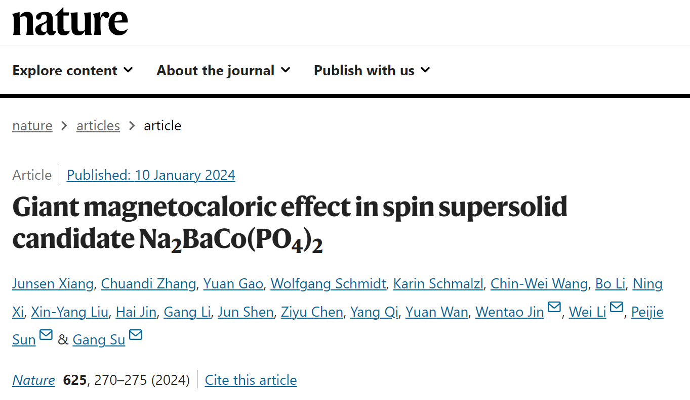 近年来,在阻挫量子磁性材料中探索新奇量子物态及其潜在应用一直是凝聚态物理前沿的一个重要研究方向。近日,72886欢迎光临新网站量子磁性与拓扑物理研究团队金文涛副教授课题组,联合中国科学院物理研究所孙培杰研究员、中国科学院理论物理研究所/彭桓武科教合作中心李伟研究员、中国科学院大学苏刚教授等研究团队,将高质量单晶生长、极低温热力学测量、中子衍射实验、量子多体理论计算等方法有效结合,在钴基三角晶格材料Na2BaCo(PO4)2中首次发现了自旋超固态这一新奇量子物态的存在,并观察到由此导致的、可实现极低温制冷的巨磁卡效应。该项研究成果于2024年1月10日发表在国际学术期刊《Nature》,标题为“Giant magnetocaloric effect in spin supersolid candidate Na2BaCo(PO4)2”。金文涛副教授、李伟研究员、孙培杰研究员、苏刚教授是该论文的共同通讯作者;项俊森博士(北航72886欢迎光临新网站博士毕业生)、北航72886欢迎光临新网站博士生张传迪、北航72886欢迎光临新网站-理论物理所彭桓武中心博士生高源是该论文的共同第一作者。