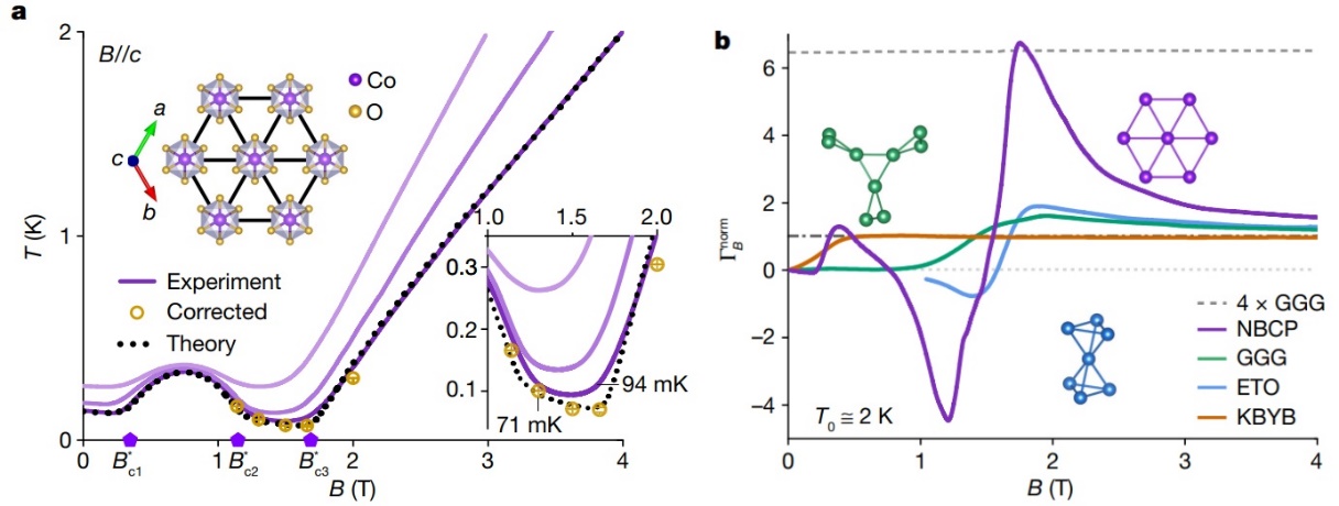 2019年,美国普林斯顿大学研究团队发现了新型钴基三角晶格磷酸盐Na2BaCo(PO4)2。前期研究观察到该材料中存在很强的低能自旋涨落,但其磁基态性质并不清楚。基于量子多体理论计算,理论物理所李伟研究员、物理所万源研究员等人提出,该材料可以由三角晶格易轴海森堡模型很好地描述,并推测其中有可能存在兼具自旋固态和自旋超流体特征的“自旋超固态”。针对这一关键科学问题,金文涛课题组合成出克量级的高质量Na2BaCo(PO4)2单晶样品,并与物理所项俊森博士、孙培杰研究员团队合作,利用高精度绝热温变测量器件,开展了极低温下的热力学和磁卡效应测量。通过绝热去磁过程,发现在自旋超固态量子临界点附近,该材料的温度急剧下降,可以到达94 mK的最低制冷温度(图1)。磁场驱动的温度下降速率(格林奈森参数)呈现出很高的尖峰,其峰值高度是目前通用制冷工质Gd3Ga5O12的四倍。由于其卓越的制冷性能来自于自旋超固态下强烈的量子自旋涨落,因此该效应可被称为自旋超固态巨磁卡效应,这是一种全新的制冷原理。