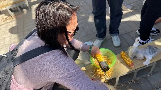 为了更深入地了解农业生产过程,女教师们还亲自尝试了玉米脱粒的过程。他们戴上手套,端起玉米棒,一遍又一遍地尝试着脱粒,最终成功地将玉米脱粒出来。大家被这个简单而又有趣的过程所吸引,收获了对农耕劳动的新认识。