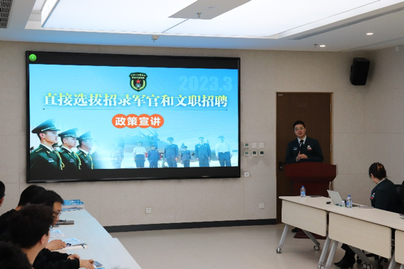 刘政良校友对直接选拔招录军官和文职招聘的相关政策规定、待遇保障等做了详细介绍,并重点就入职后的职业发展道路和同学们做了深入交流。此外,他结合自身经历现场解答了同学们比较关心的一些问题,并向参会同学发出了诚挚的入职邀请。