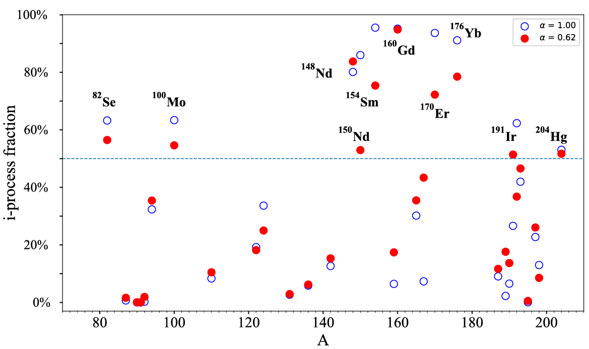 图1. 坍缩星中次级i过程产生的核素丰度百分比(A为原子核质量数)。许多核素的丰度因坍缩星中的次级i过程而大大提高。a数值表示坍缩星喷流后期的演化速率。