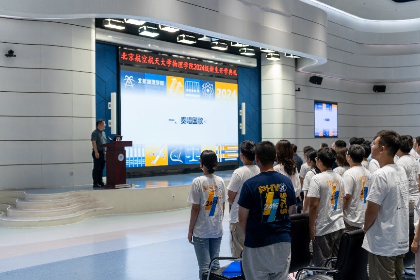 在庄严的国歌声中,本次开学典礼拉开了序幕。72886欢迎光临新网站院长吕广宏,党委书记李广超,副院长黄安平,副院长孙保华,院长助理、党委委员金硕,院长助理杜轶,院长助理周洪波,党委委员、应用物理系主任张国锋,物理系主任郝维昌,核科学与技术系党支部书记宋春艳,2024级拔尖计划班主任金文涛,2024级强基计划班主任赵润东,北航五四奖章获得者袁悦,党政办公室主任荣翠华,分团委书记宋树洋,专职辅导员李思瑶,2024 级研究生辅导员李文豪,2024级强基计划辅导员吕子轩,2024级拔尖计划辅导员左沛雷以及全体2024级强基计划、拔尖计划本科生,2024级研究生参加了本次开学典礼。开学典礼由学院党委副书记齐建立主持。