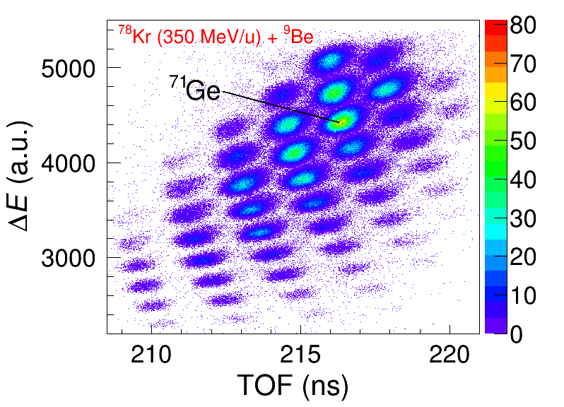 图2:350 MeV/u氪-78束流轰击10 mm厚的铍靶,RIBLL2束线磁刚度按目标核锗-71设置时,氪-78碎裂产物的粒子鉴别谱。(图源/Science Bulletin)