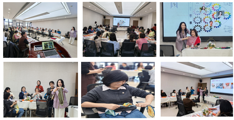 在活动中,特别邀请的高级形象设计师会允开展了“丝意人生,做“巾”致女人”的美学课堂,向教师们揭秘了如何用丝巾提升职业形象。她从光学三原色理论出发,详细讲解了冷暖色调与肤色、场合的搭配原则,并从花色与素色搭配、同色系搭配、撞色搭配、整体呼应搭配以及温柔与硬朗风格的搭配等多个角度,教授了丝巾的多种搭配技巧。同时,结合女性教师们常见的穿搭场景,以“物理人”所熟悉的几何线条为灵感,示范了如何通过折叠、缠绕等手法将丝巾变幻成颈间风景的多种百搭系法。教师们纷纷动手实践,平结、玫瑰结、麦穗结等造型在她们的巧手之下逐一呈现。“丝巾不仅是装饰品,更是展现个性的画布!”物理实验中心的王老师感慨道。在欢声笑语中,一贯严谨的“科研范”悄然绽放出柔和知性的光彩。