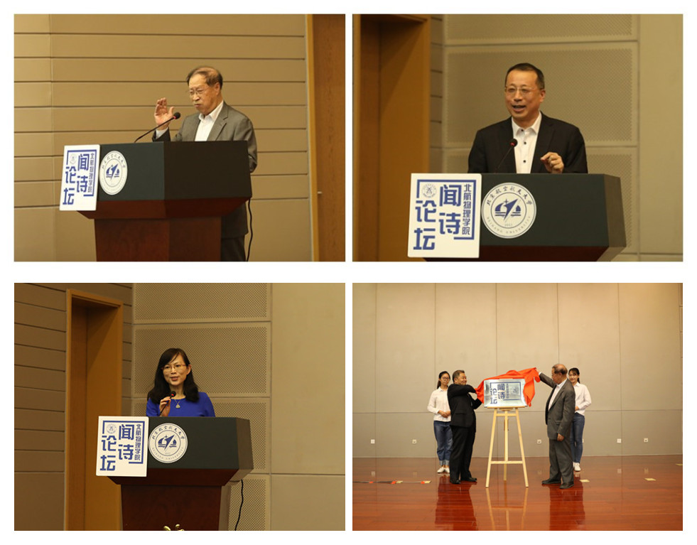 全场师生在三位代表的发言中,忆往昔、看今朝、望未来,深深感受到物理学科发展过程中凝聚沉淀下来的精神力量,在这精神力量的鼓舞下、全场激情热烈的掌声中,房建成院士与闻邦椿院士共同为“闻诗论坛”揭牌,北航闻诗论坛正式启动。