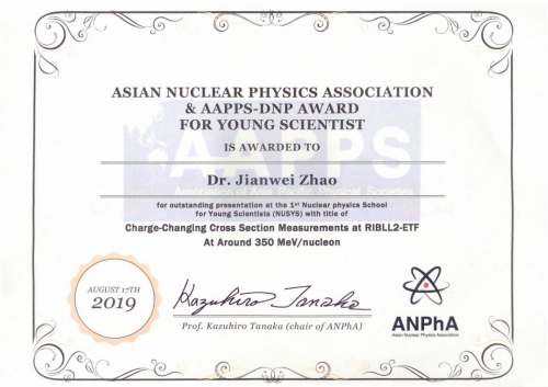 On August 17, 2019, Dr. Zhao Jianwei from the School of Physics of Beihang University was awarded Young Scientist by Asian Nuclear Physics Association (ANPhA) for his outstanding presentation a...