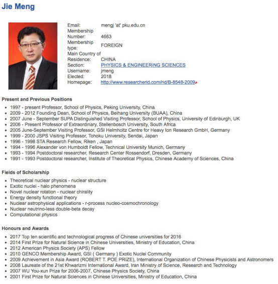 Professor Meng Jie has made creative progress in the chiral symmetry, halo-like phenomena, pseudospin symmetry and covariant density functional theory of the nucleus and promoted the advanced experimental research worldwide in high-precision measurement of the nuclear mass and search for chiral nucleus. Until now, Professor Meng Jie has published 400-odd academic papers which has been cited over 10 thousand times and his H-index is 53. Among those highly-cited papers, 19 papers have been cited over 100 times. Professor Meng Jie is the first Cheung Kong Chair Professor in Particle Physics and Nuclear Physics appointed by the Ministry of Education of the PRC and the winner of the National Science Fund for Distinguished Young Scholars in 2000. He also once won the first prize of Natural Science in Chinese Universities in 2000 and 2013 respectively, the Wu Youxun Prize of Physics in 2007, the Khwarizmi International Award in 2008, AAA Robert T Prize in 2009 and Genco Award in 2010. Furthermore, Professor Meng Jie was elected as a member of the American Physical Society (APS).