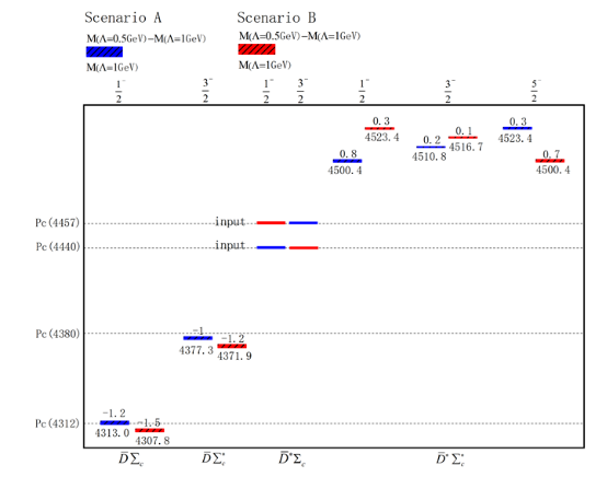 Fig. 1: Mass and spin-parity of the septuple molecular state predicted based on effective field theory. Scenario A: The predicted spin of Pc(4457) and Pc(4440) is 3/2 and 1/2; Scenario B: The predicted spin of Pc(4457) and Pc(4440) is 1/2 and 3/2. Their parities are both negative.