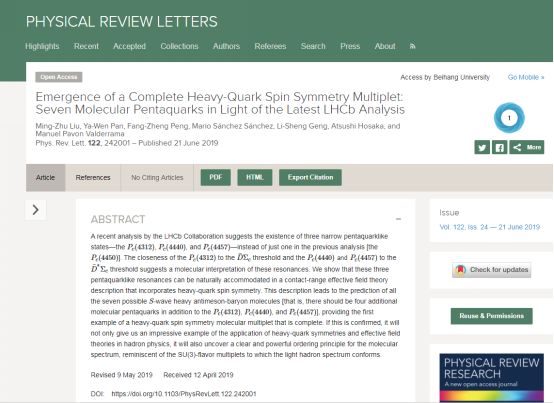 Jun. 28 (Beihang News) - Recently, the team of Professor Geng Lisheng of the School of Physics and Nuclear Energy Engineering and its foreign partners have used the effective field theory description to study the three pentaquark states discovered previously by the LHCb Collaboration of the European Organization for Nuclear Research. They find the molecular interpretation of these particles as Dbar(*) Sigma_c(*), and predict four additional molecular pentaquarks of Dbar(*) Sigma_c(*). The Dbar(*) and Sigma_c(*) here are the ground state meson containing anti-charm quarks and the ground state baryon containing charm quarks. On June 21, the research finding, titled “Emergence of a Complete Heavy-Quark Spin Symmetry Multiplet: Seven Molecular Pentaquarks in Light of the Latest LHCb Analysis”, was published online onPhys. Rev. Lett.122, 242001 (2019), and hasalso drawn the attention ofScience Magazine.