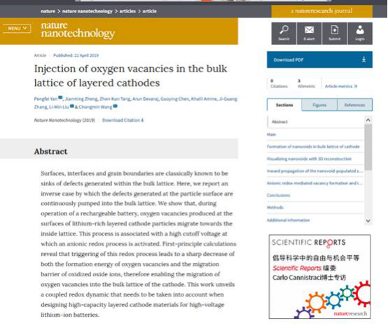 Beijing, Apr. 22 -Nature Nanotechnologyhas published the research results in the field of layered metal oxides online, titled “Injection of oxygen vacancies in the bulk lattice of layered cathodes”. Through experiments and theoretical calculations, the article presents that the diffusion and activation of oxygen ions in layered oxidation material is easier than previously realized.
