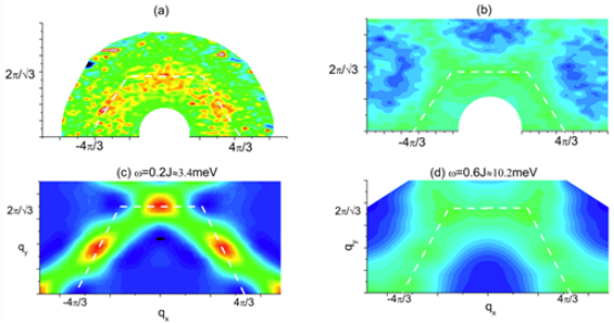 Figure: Comparison between the inelastic neutron scattering spectrum of spin liquid material Herbertsmithite and numerical results of the dynamic structural factor of kagome Heisenberg spin system.